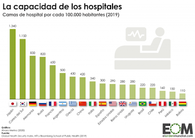 Ya denuncié en su día que el sistema sanitario español dista mucho de ser ejemplar. Tiene múltiples fallos, empezando porque no hay suficientes médicos, siguiendo por las listas de espera, y terminando por el mal ratio de camas por población. En estos gráficos se puede ver que hay países con mucha mayor capacidad que España en cuanto a médicos y camas de hospitales respecto a la población.